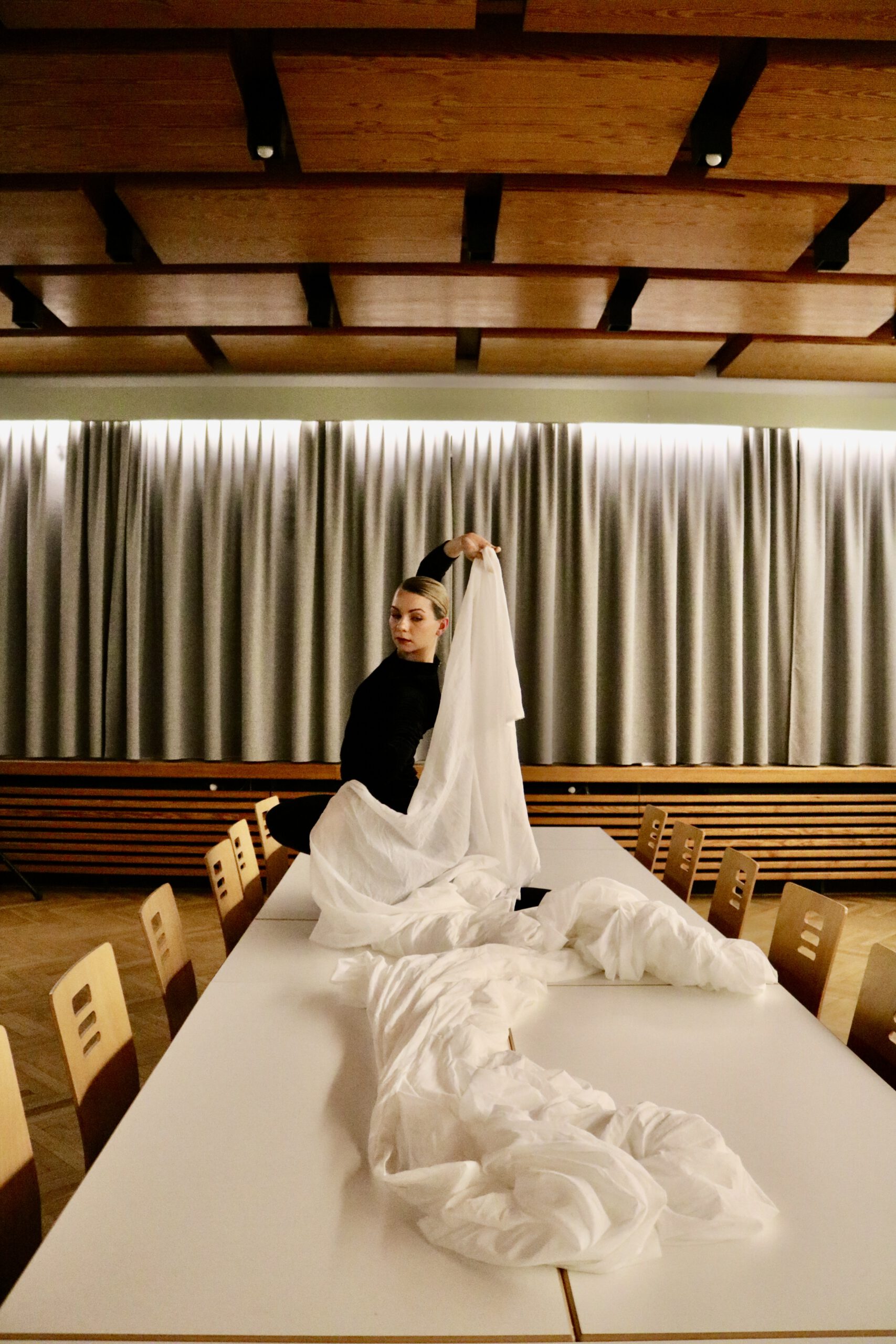 In „Morphose“ kümmern sich Hausdamen um seine Belange, seine Sorgen und Wünsche. Sie vermitteln zwischen Haus und Mensch. Durch sie erfährt das Publikum von weiteren Räumen im Gebäude und Erlebnissen, von herausfordernden und schmerzlichen, von bereichernden und freudvollen. Sie erzählen von der Morphose des Saales und erstatten ihm gleichzeitig Bericht über die menschliche Umgebung. Denn das Haus hat Fragen. Was ist dieses „Mensch sein“? Und hat es zu unterschiedlichen Zeiten verschiedene Bedeutungen, Mensch zu sein? Ist Mensch sein eine Morphose? Und wie bewegen sich Mensch und Raum mit und gegeneinander im Spannungsfeld ihrer Morphosen? Lassen wir uns bewegen.